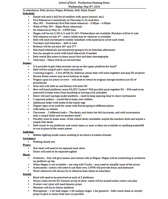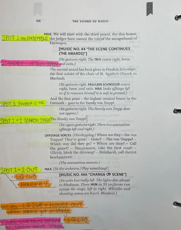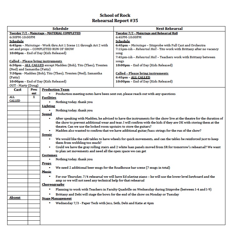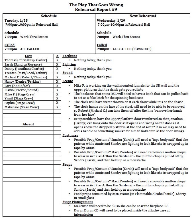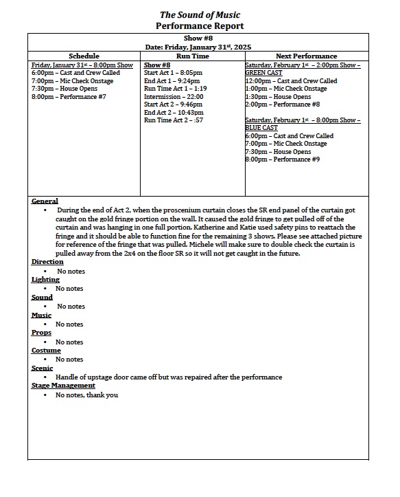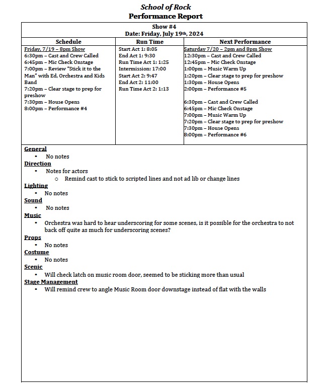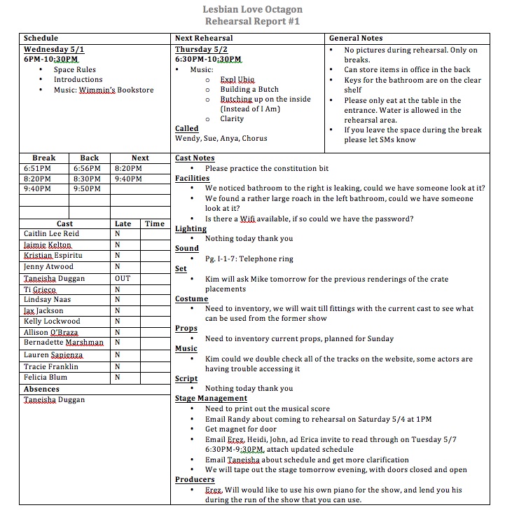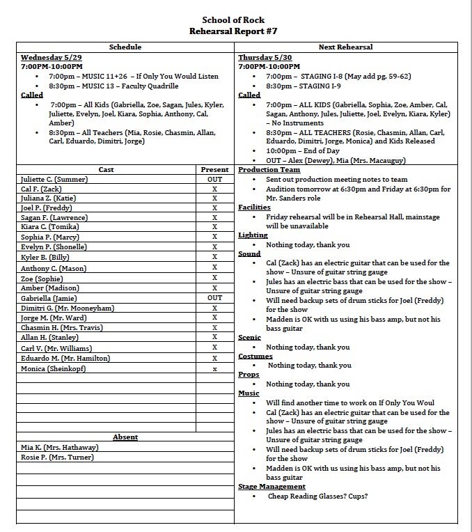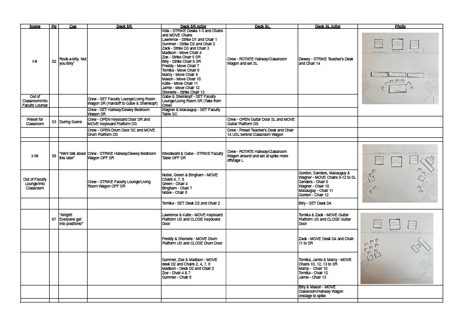 I have experience with all aspects of stage management, from pre-production to rehearsals and show calling. Below are some examples of past paperwork and calling scripts.